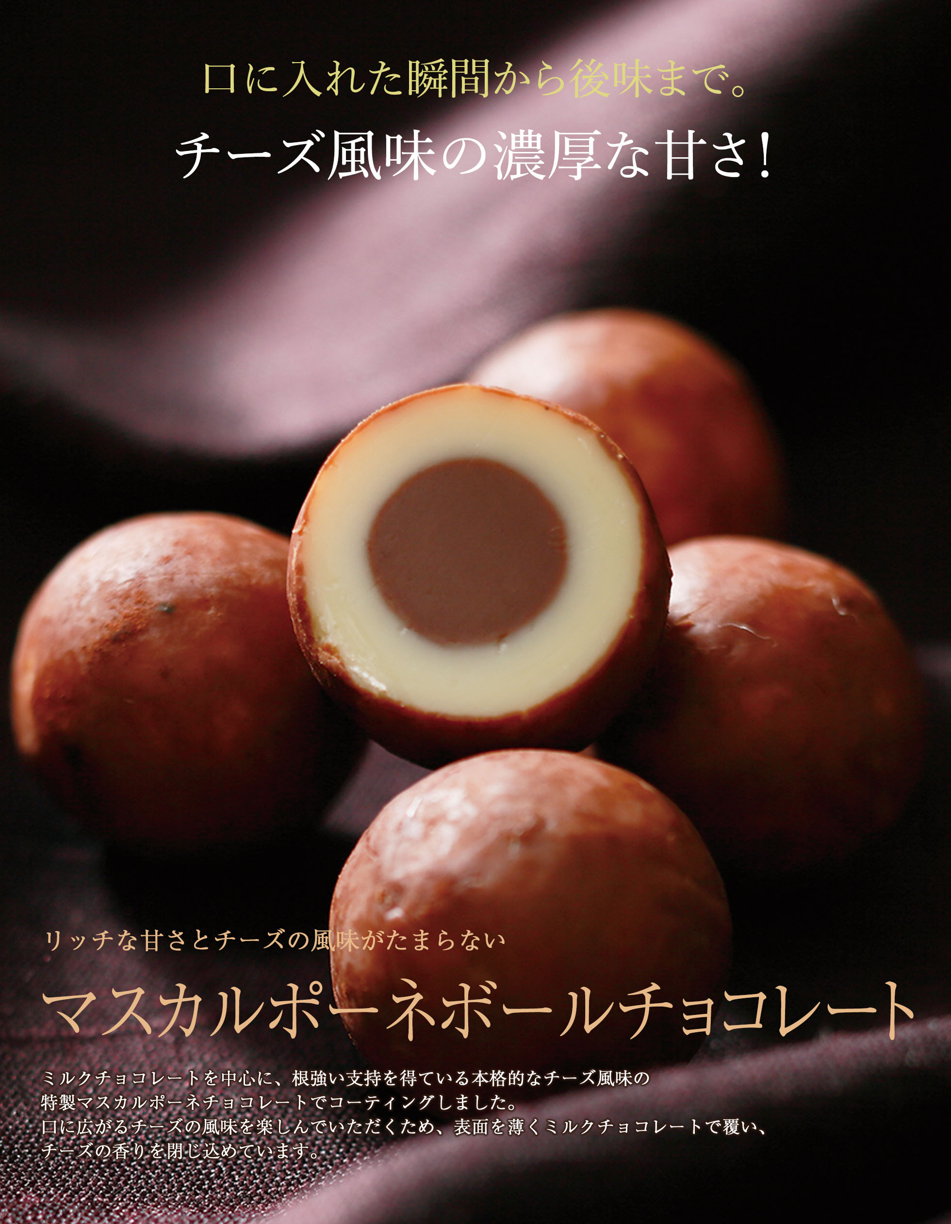 ミルクチョコレートを本格的なコクとチーズの香りが特徴のマスカルポーネチョコレートで包み、仕上げにミルクチョコレートで薄くコーティングしています。