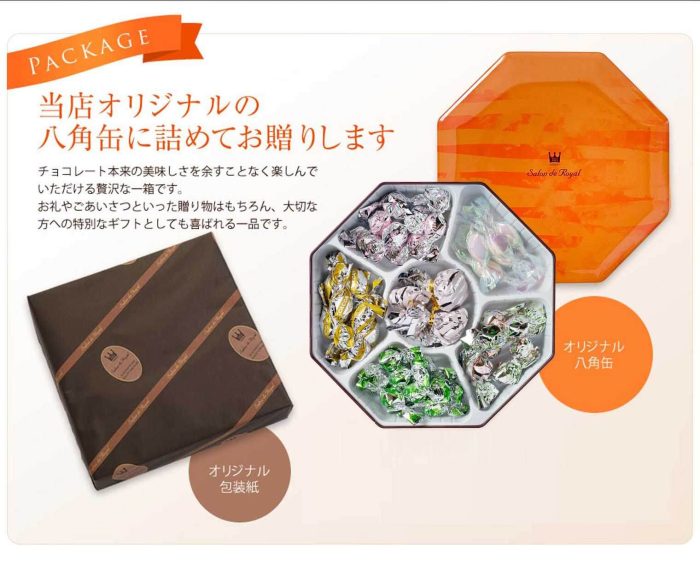 サロンドロワイヤルのチョコレートギフト(35個/缶)は、6種類のチョコレートを八角形のギフト缶に詰め合わせた人気商品です。
